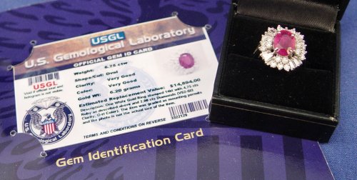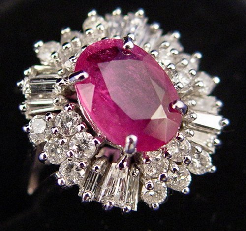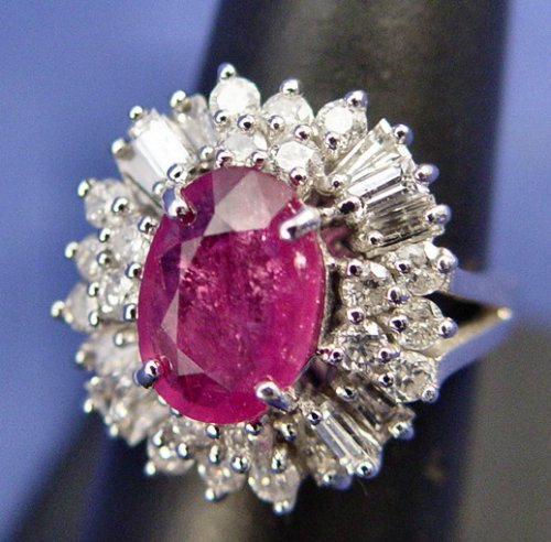 6.75ctw RUBY AND DIAMOND RING: Featuring a 4.75ct oval cut ruby surrounded by 2ctw of round and baguette cut diamonds, clarity VS2-SI3 and color G-H, 14k white gold, size 7, 6.2 grams. Sold with USGL Gem ID Card, $14,894 estimated replacement value. Est. $3000/5000**