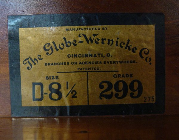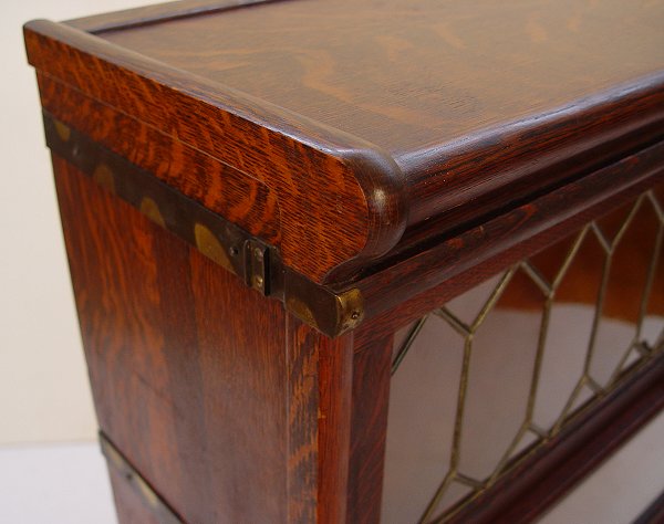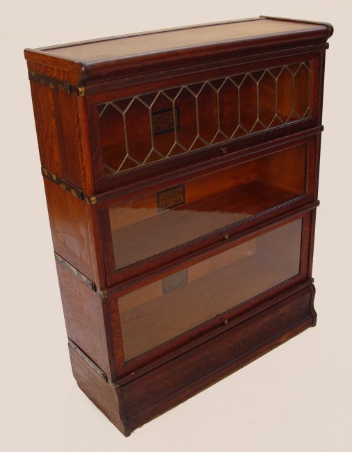 GLOBE WERNICKI LEADED GLASS OAK STACKING BOOKCASE: 3 section bookcase with upper section having leaded glass. The top two sections are D 8 1/2, the bottom section is D 10 1/2''. 43 1/2''h. x 34'' x 12'' overall. A match to the following lot 1181 if you desire a pair.