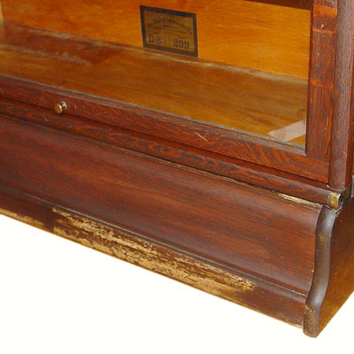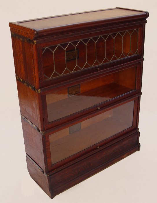 GLOBE WERNICKI LEADED GLASS OAK STACKING BOOKCASE: 3 section bookcase with upper section having leaded glass. The top two sections are D 8 1/2, the bottom section is D 10 1/2''. 43 1/2''h. x 34'' x 12'' overall. A match to the previous lot 1180 if you desire a pair.