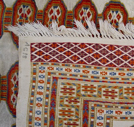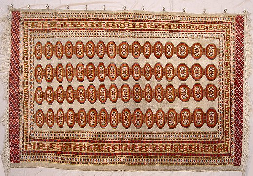 PERSIAN BOKHARA DESIGN RUG: Fine tightly woven carpet, cream ground, fitted with metal rings for hanging. 4' x 6'.
