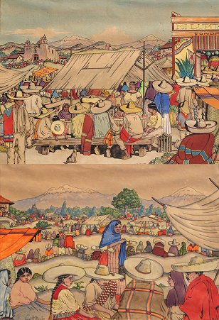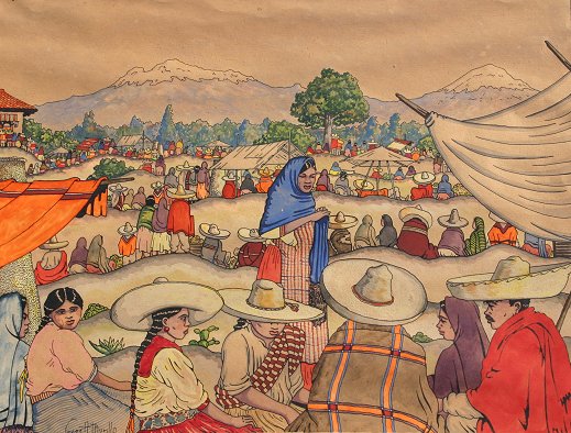 MURILLO, Jorge A., (Mexican, 20th C.): 2 Mexican Village Scenes, W/C's, 14'' x 18'', signed, gilt and painted frames with wear, 22'' x 26''.