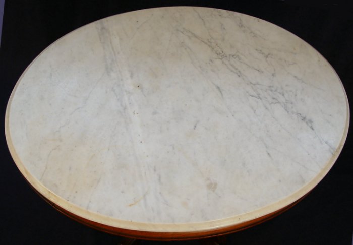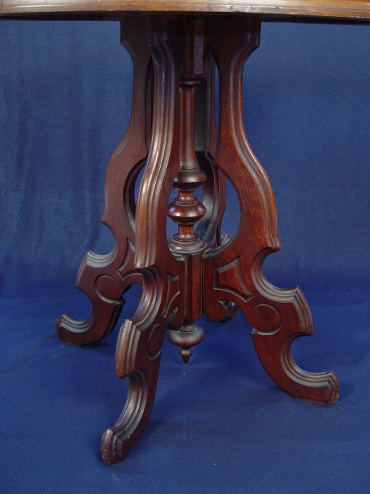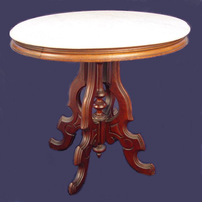VICTORIAN MARBLE TOP LAMP TABLE: White oval marble top, mahogany base with shaped and scrolled legs. 26''h. x 29'' x 21''.