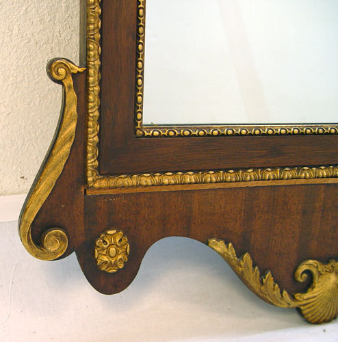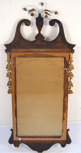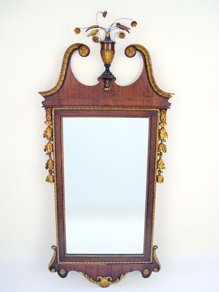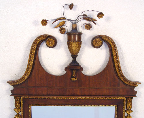 MAHOGANY AND GILT WOOD MIRROR: Early 20th C mirror crested with a flower filled urn. 53'' x 23 1/2''