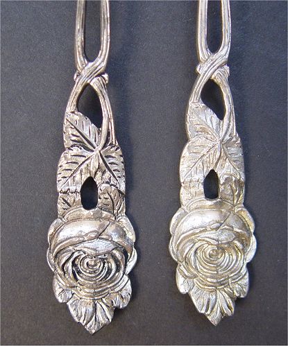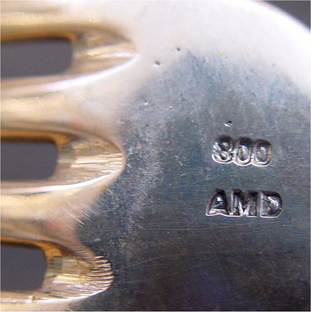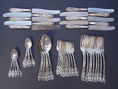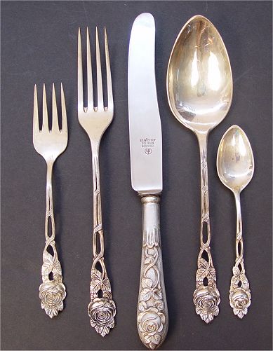 ORNATE ROSE HANDLE 800 SILVER FLATWARE SERVICE: Adam Mann & Sohn Silberwarenfabrik, Germany. 46 piece service for 10 to include 10 dinner knives (9 1/4''), 10 dinner forks (8 1/2''), 10 salad forks, 10 teaspoons, and 6 large service spoons. Hollow handle repousse knife handles with Solingen blades. The forks and spoons have pierced and repousse handles.