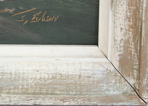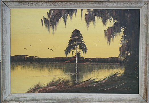 GIBSON, James, (American, 20th C.): Florida Highwaymen Coastal Sunset, O/B, 24'' x 36'', signed, original frame with wear, 28'' x 40''. Dent and abrasion, paint loss in right margin.