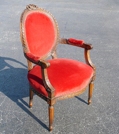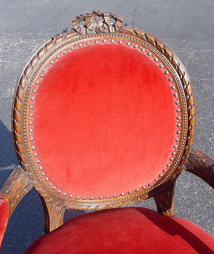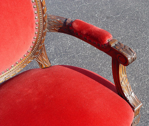 FRENCH BERGERE CHAIR: Carved mahogany frame, red upholstery. 37 1/2''h. x 23 1/2'' x 20''.