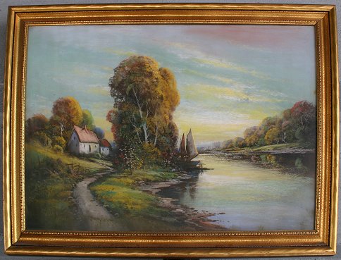 RIVER LANDSCAPE PASTEL WITH COTTAGE AND BOATS: Circa 1910, 24'' x 36'', signed Cullen?, gilded frame, 29'' x 41''.