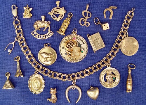 14K GOLD CHARM BRACELET WITH 20 CHARMS: 7 1/4''l. double link bracelet with five attached charms and 15 loose, 42.2 grams.