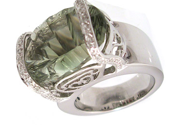 17.58CT PRASIOLITE RING: 14k white gold ring featuring a 17.58ct millenium cut prasiolite side set and secured by diamond encrusted bands, approx. .08ctw of diamonds, size 7, 17.7 grams. Est. $500/700**