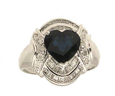 2.83CTW HEART SHAPED SAPPHIRE AND DIAMOND RING: 14k white gold ring centered by a heart shaped blue sapphire of 2.37ct, surrounded by round and baguette cut diamonds, approx. .46ctw, size 7, 5.1 grams. Est. $500/700**
