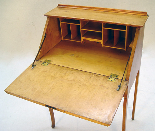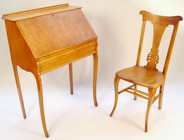 BIRDS EYE MAPLE LADIES DESK AND CHAIR: Petite fall front desk with interior cubicles. Sold with the matching chair. 39''h. x 28'' x 18''.
