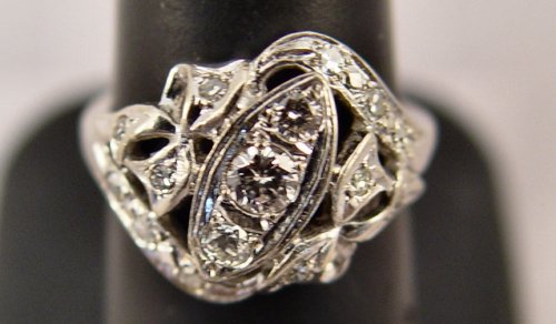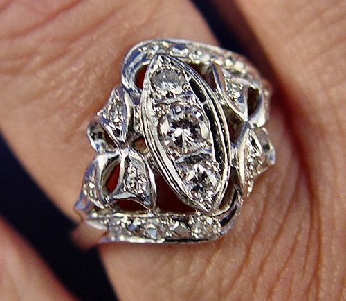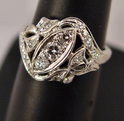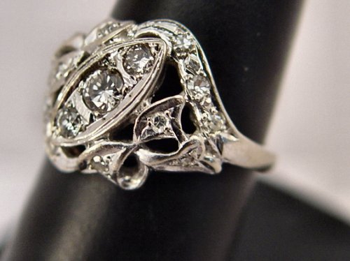 DELICATE DIAMOND FILIGREE RING: 14k white gold mounting in an open work ribbon motif set with a mix of round cut diamonds, approx. 1/4ctw, size 6.25, 3.8 grams.