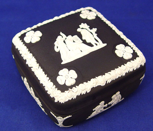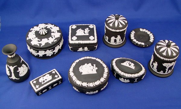10 PIECE GROUP OF BLACK WEDGWOOD JASPER: White on black. 10 pieces are 1) 4'' square box 2) 4 3/4'' tall vase 3) a 4 1/2'' tall covered cannister 4) a 4 1/2'' tall covered cannister 5) a 4 1/2'' oval box 6) a 5'' round covered box 7) another 5'' round covered box 8) a 3 1/2'' long covered box 9-10) two small ashtrays. All are impressed ''Made in England Wedgwood''.