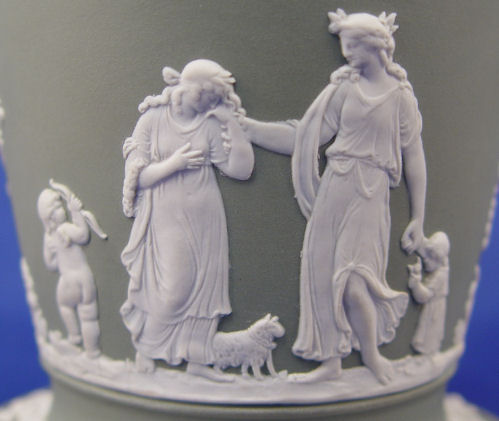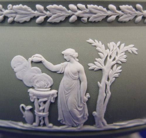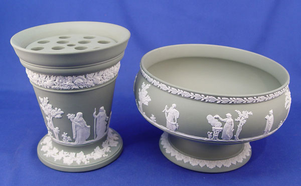 WEDGWOOD GREEN JASPER VASE AND COMPOTE: 1) Flare rimmed vase with flower frog, 6 3/4''h, 6'' dia. at the rim. 2) Pedestal bowl compote is 5''h. 8'' dia. Both pieces are white on green and impressed ''Made in England Wedgwood''.