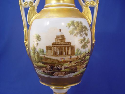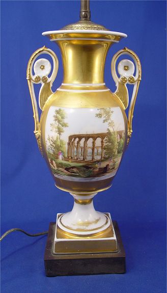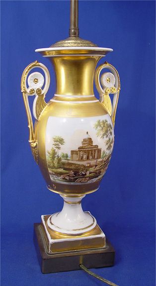HAND PAINTED PORCELAIN URN LAMP attrib. to FURSTENBERG or OLD PARIS: Scenic paintings front and verso, scroll handles, some wear to the gold. Two part construction with chips at the pedestal, visible only when turned upside down. Porcelain is 12 1/2''h., the lamp is 27''h.