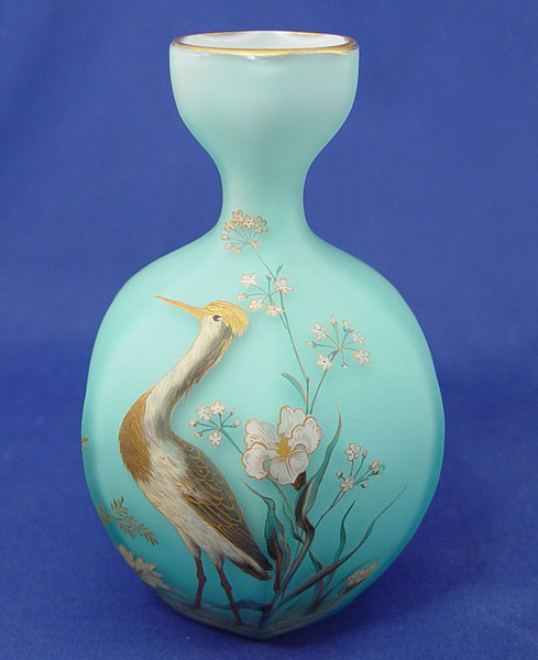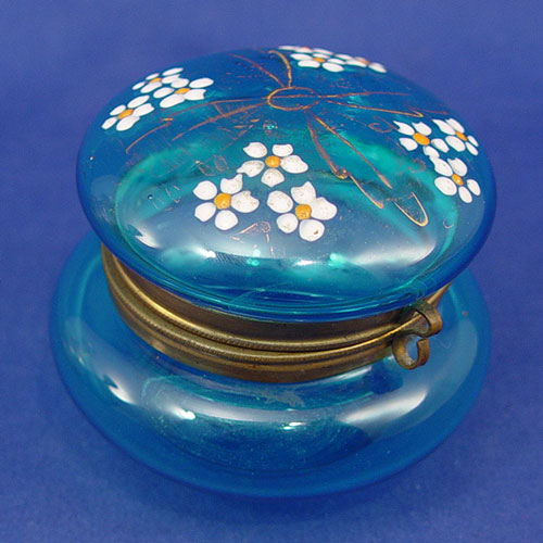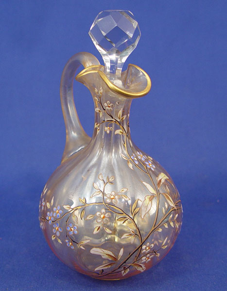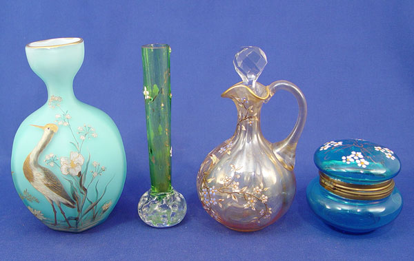 4 PIECE GROUP OF ENAMELLED GLASS: 1) Victorian hand painted blue cased glass vase, 6 1/2''h. 2) Light amber blown glass cruet decorated in flowers, faceted stopper, 6 1/2''h. 3) blue dresser jar with hinged top, 2 1/2''h. 3 1/2'' dia. 44) Bark type green glass bud vase, 6 1/4''h.