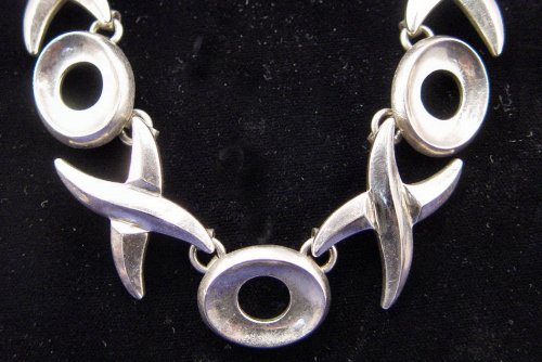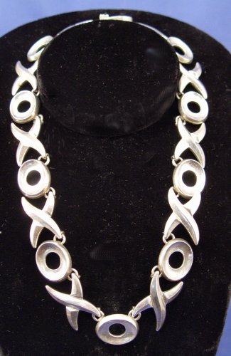 MEXICAN STERLING XO NECKLACE BY EMMA MELENDEZ: Alternating links of X and O with pressure clasp, marked to back of X links Sterling Mexico Emma 69? TM ?, 118 grams, 16 1/2''l.