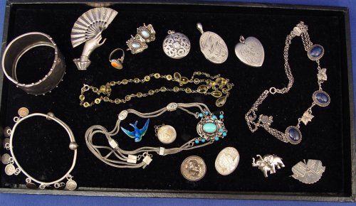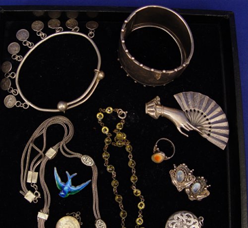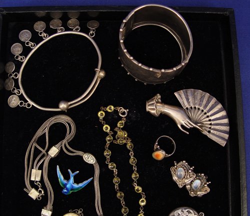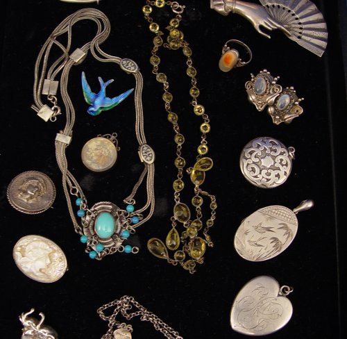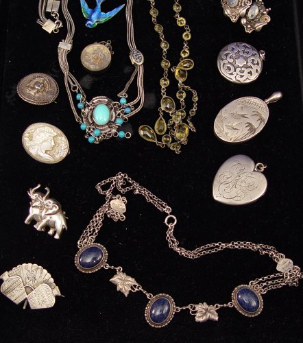 LOT OF VICTORIAN SILVER AND STERLING JEWELRY: To include, a wide bangle etched with birds and bead trim 1 1/2''w., opening approx. 2 1/8'' x 2''; three necklaces - lapis, turquoise, citrine?; ankle coin bracelet, lockets, pins, etc.