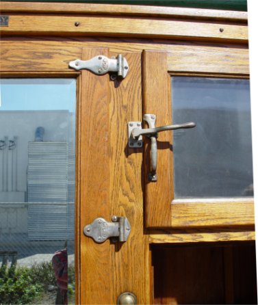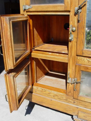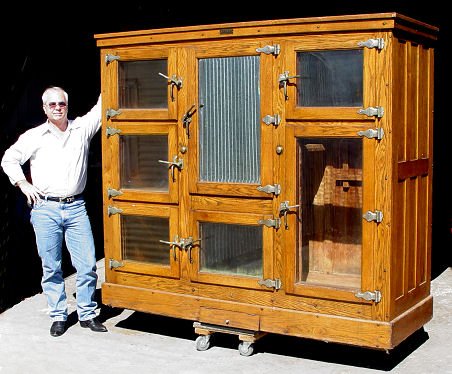 McCRAY GROCERS GOLDEN OAK 7 DOOR ICE BOX: Paneled sides, tin bottom on the interior. 76''h. x 85''l. x 32''deep. Please call for condition of this fine piece of American heritage.