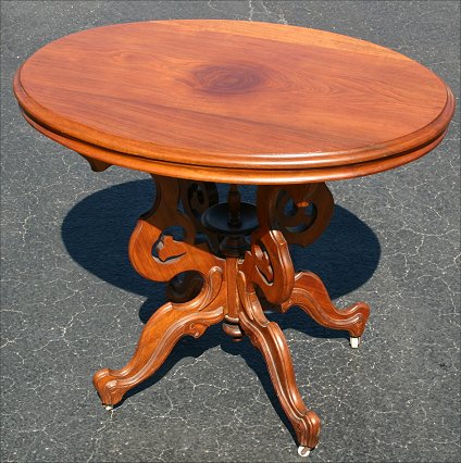 VICTORIAN WALNUT OVAL TOP LAMP TABLE: Porcelain castors, turned finial base, shaped legs and reverse finial.