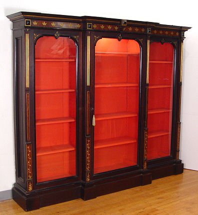 RENAISSANCE REVIVAL VICTORIAN BOOKCASE: Featuring incised carvings, some accentuated with gold paint, burled panels, and triple glass front doors. Interior painted Chinese red, adjustable wooden shelves. 74 1/2''h. x 86''l. x 18 1/2'' deep overall.