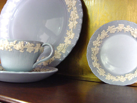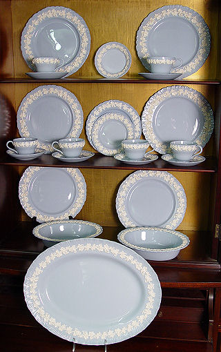 WEDGWOOD QUEENSWARE CHINA SERVICE FOR 6: Raised white grapevine on blue. 39 pieces to include 6 each of dinner plates, salad plates, bread plates, dessert bowls, cups and saucers. Also included are the large 16'' platter and 2 oval vegetable bowls. Excellent condition.