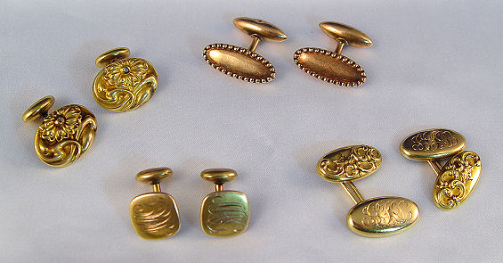 ESTATE LOT OF 4 PAIRS VICTORIAN 10 & 14K GOLD CUFFLINKS: Lovely embossed design to one pair marked Kohn; and a pair with floral embossed top set with tiny diamond chips; one monogrammed MAG; and the last set with simple bead edging.
