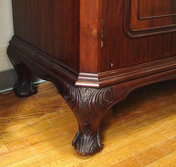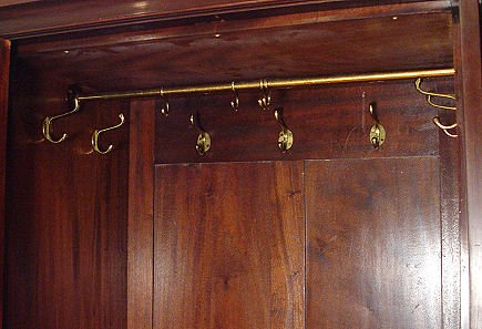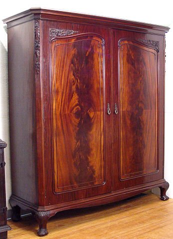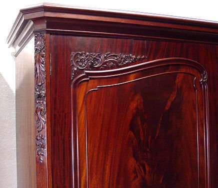 HANDSOME CROTCH GRAIN MAHOGANY ARMOIRE CABINET: Late 19th early 20th C. Highest quality cabinetry. The divided interior has garment hooks and rod on one side, shirt drawers and 4 drawers with brass pulls on the other. Carved stiles and feet, overhanging molded cornice. 6 1/2 ft. h. x 67''w. x 24'' deep overall.