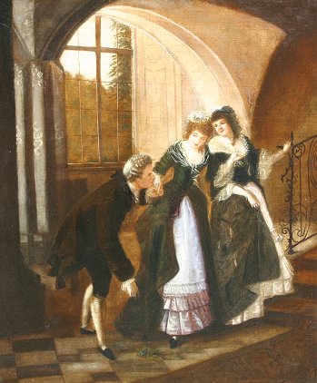 19TH C. FRENCH COURTSHIP PAINTING: O/C/B, 36'' x 30'', faintly signed LR, later worn frame, 45'' x 39''.