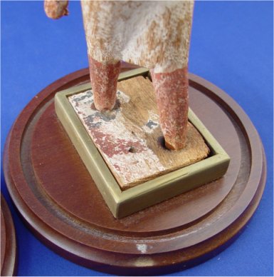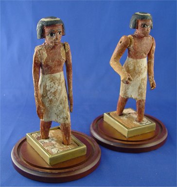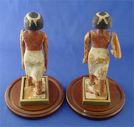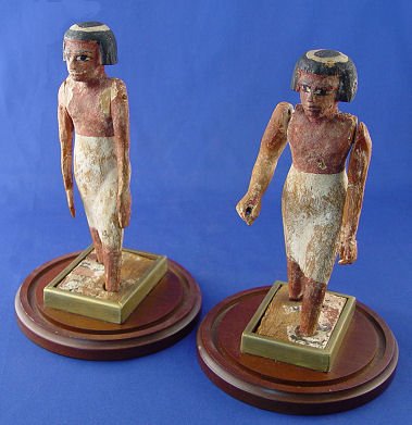 TWO EGYPTIAN CARVED ANTIQUITY FIGURES: These burial figures of servants come with a paper label that states they were ''Authenticated by Dr. Cooney as 11th Dynasty Egypt University of Ohio 1970''. A John Cooney was curator of Egyptian art at Brooklyn Museum of Art 1947-63. Each has written on the bottom ''Sakkara 2200 BC''. 9 1/2''h.