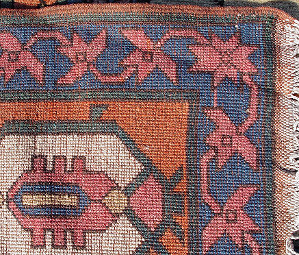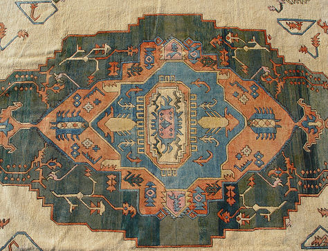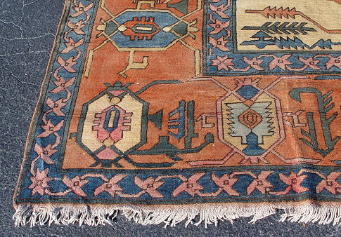 HAND WOVEN TURKISH CARPET: Beige ground and terra cotta border with overall geometric pattern, approximately 15'2'' x 13'1'' plus fringe. Est. $2500/3500**