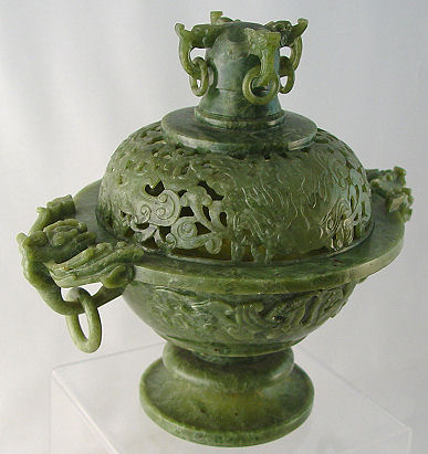 CHINESE CARVED SPINACH JADE CENSOR: Reticulated cover with ringed elephant heads and ring handles. 8 3/4''h. x 9 1/2''dia.