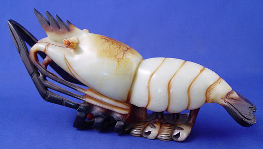 CHINESE CARVED NEPHRITE JADE LOBSTER: Two tone brown and green life like carved rendition of a lobster. 5 1/2''l. x 11 1/2''l. Est. $600/800**