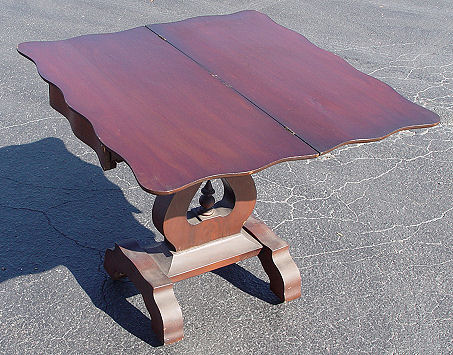 19TH C CROTCH GRAIN MAHOGANY GAME TABLE: Richly grained mahogany with shaped top, harp type pedestal base with drop finial. 31''h. x 43 1/2'' x 17''.