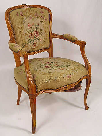 FRENCH OPEN ARM CHAIR WITH NEEDLEPOINT SEAT AND BACK: Carved frame, 33''h. 23''w.