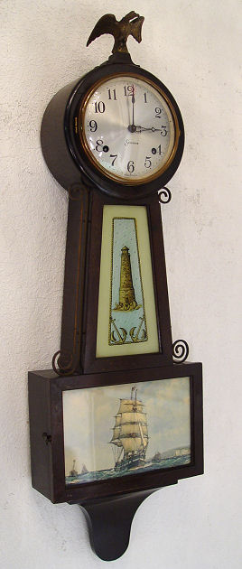 VINTAGE SESSIONS TALL SHIP BANJO CLOCK: Mahogany case clock with eagle finial, lighthouse and tall ship scene on the glass doors. Key wind, gong strike, all original. 34''l.