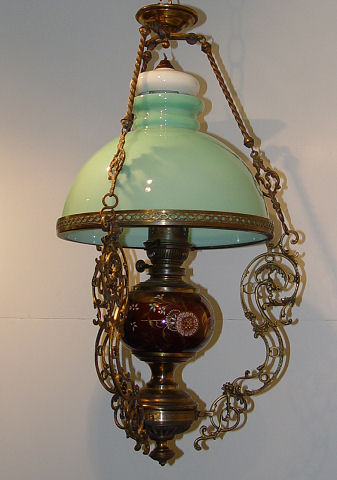 FRENCH VICTORIAN HANGING OIL LAMP WITH ORIGINAL SHADE: With enameled pottery font and original jadeite green glass shade. Ornate brass filigree mounting. Hangs 31''h., the shade is 13''dia. Sold with parts for adjustable height chains and weight.