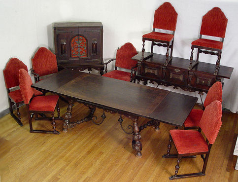 EARLY 20TH C AMERICAN GOTHIC DINING ROOM SET WITH IRON STRETCHERS: 11 piece set includes draw leaf table, 62'' x 37'' (98''l with leaves extended), set of 8 chairs, (2 with arms), a china cabinet 55''h. x 40''w., and a sideboard buffet, 36''h. x 59''l. x 21''.