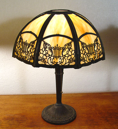 VINTAGE 1920'S CARAMEL SLAG GLASS TABLE LAMP: 8 panels with filigree metal shade, single socket pull chain, lamp is 20 1/2''h. shade is 14 1/2'' dia.