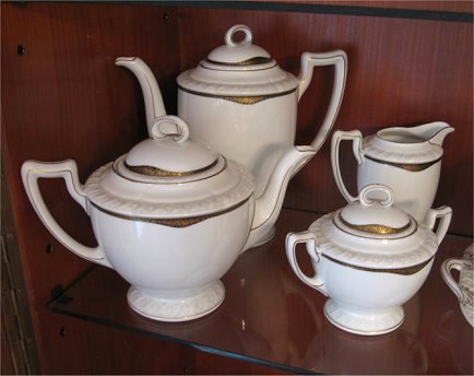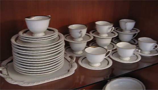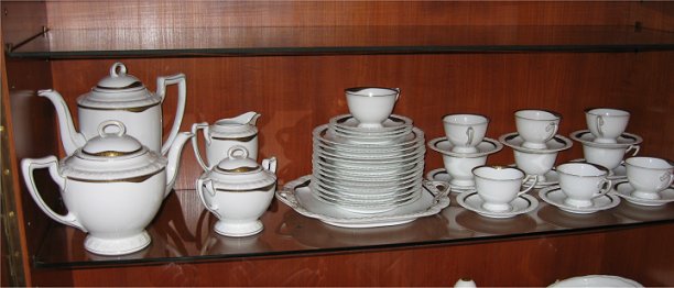 HUTSCHENREUTHER FINE CHINA DESSERT AND COFFEE SERVICE: 39 pieces to include serving plate, coffee pot, tea pot, cream pitch, sugar bowl, 12 plates, 10 cups and 12 saucers.
