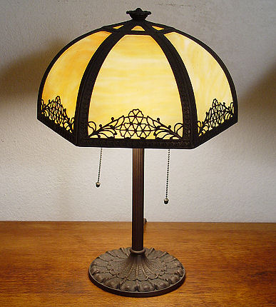 VINTAGE 1920'S CARAMEL SLAG GLASS TABLE LAMP: 6 panel dome top shade, double socket pull chains ending in acorns. 19 1/2''h. shade is 12 1/2'' dia.