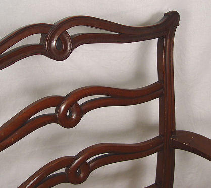 SET OF 6 MAHOGANY CHIPPENDALE DINING CHAIRS: A substantial set of ribbon back dining chairs, 2 have arms, 4 are side chairs. 39''h., the seats are 18'' from the floor, 22''w. Please call for condition.