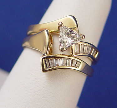 DIAMOND BRIDAL SET: Featuring a modified triangular brilliant cut diamond, clean and white, approx. 39 pts, measuring approx. 5mm x 5mm x 2.8mm, set in 14k yellow gold with approx. 15pts of tapered baguettes, size 6, 5 grams.