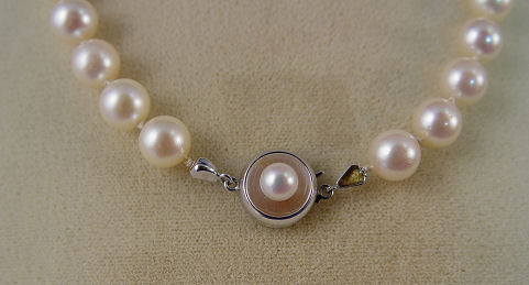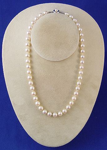 18'' STRAND OF 8.5MM PEARLS: Lovely estate strand of creamy pearls, double knotted, 14k white gold clasp marked 585, topped by a 5.5mm pearl.