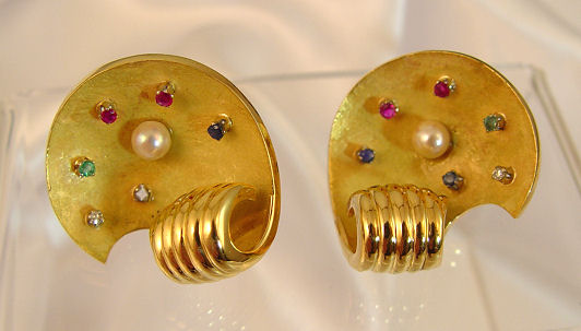 18K & GEMSTONE PAINTER'S PALLET EARRINGS: Polished and brushed yellow gold omega back earrings in the form of painter's pallet scattered with tiny gemstones (missing one) and centered by a white pearl of approx. 5mm, marked verso Italy K18, 18.5 grams.