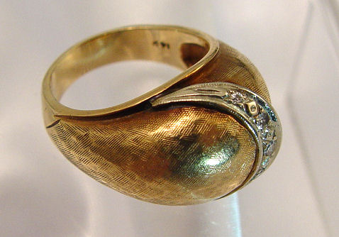 14K DOMED DIAMOND RING: Textured yellow gold ring with a domed top crossed by a band of five tiny diamonds set in white gold, size 7.5, 10 grams.