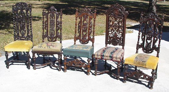 GROUP OF FIVE 19TH C HEAVILY CARVED OAK CHAIRS: One pair, the other three are each different from the others. Tallest is 52 3/4''h. The seats are a nice combination of velvet, needlepoint and tapestry.