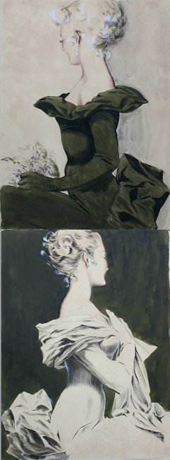 PAIR of WATERCOLOR ILLUSTRATIONS COSTUME & FASHION: Circa 1940's, 20'' x 14'', no visible signature, white painted frames, 25'' x 20''.