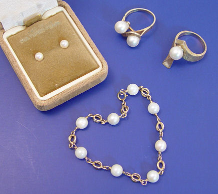 LOT OF ESTATE 14K PEARL JEWELRY: To include, double pearl ring 7.8mm white pearls size 7.5; single pearl ring 8.2mm white pearl size 8; 6.8mm pearl and open gold link bracelet 7.5 inch; 5mm pearl studs. 19.5 grams total.