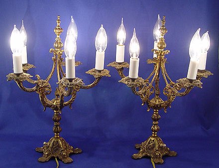 PAIR of ELEGANT BRASS CANDELABRA LAMPS: Brass 5 light lamps. 15 3/4''h. Rewired and new sockets for safety.